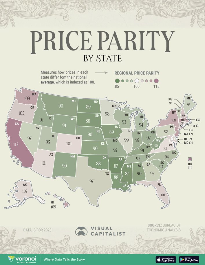 The Visual Capitalist asks; How much do prices actually differ across America? Today’s graphic takes a look at price parity across the U.S. by looking at things like the price of food, bills, gas, and other living costs. Not surprising, California is the nation’s most expensive state with Arkansas, Mississippi, and Oklahoma being the least expensive. Stay safe, watch your wallet and have a Happy Friday!!! Hat tip to the Visual Capitalist. The post The Least & Most Expensive U.S. States appeared first on Real Estate Investing Today.