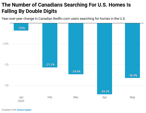The number of Redfin.com users based in Canada searching for U.S. homes to rent or buy fell 26.4% from a year earlier in May. That’s a sign that fewer Canadians are moving south of the border or seeking vacation homes in once-popular destinations like Miami and Phoenix. Fewer Canadians are searching for homes in the United States than they were at the start of 2025, before the U.S. instituted steep tariffs on Canada and relations between the two countries started suffering. The number of Canadian Redfin.com users searching for homes in the U.S. on Redfin.com dropped 26.4% year over year in May. For comparison, the total number of prospective buyers and renters searching on Redfin.com declined, too, but by a fraction of the amount. Canadians searching for homes in U.S. destinations started declining significantly in February, when the White House implemented 25% tariffs on imports from Canada and Mexico. The drop …