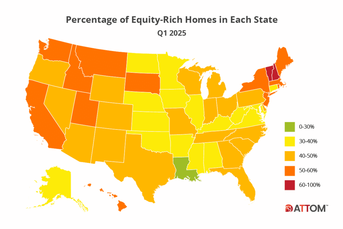 ATTOM’s latest data on mortgage equity for the first quarter 2025 show that the number of equity-rich mortgages remain historically high in the nation overall. Although equity-rich rates fell in 47 states quarterly, annually, the rates in the majority of states were higher. An equity-rich mortgage is defined as one where the loan balance is no more than half of their estimated market value. In the first quarter of 2025, 46.2 percent of mortgaged residential properties in the country were considered equity-rich, down from 47.7 percent in the fourth quarter of 2024. Here’s a closer look at the equity trends in the nation and by state. Equity-Rich Mortgages by State Vermont Vermont had the highest percentage of equity-rich mortgages in Q1 2025. The percent increased from 82.0% to 85.8% from Q1 2024 to Q1 2025. In Vermont, close to every mortgage is equity rich. The counties with the most equity-rich …