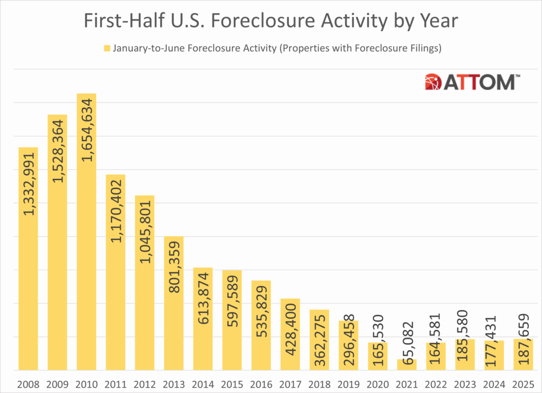 U.S. Foreclosure Starts increase 7 Percent in First Six Months of 2025; Average Days to Complete a Foreclosure Down Third Quarter in a Row; June and Q2 2025 Foreclosure Activity Post Annual Increase IRVINE, Calif. — July 17, 2025 — ATTOM, a leading curator of land, property data, and real estate analytics, today released its Mid-Year 2025 U.S. Foreclosure Market Report, which shows there were a total of 187,659 U.S. properties with foreclosure filings — default notices, scheduled auctions or bank repossessions — in the first six months of 2025. That figure is up 5.8 percent from the same time period a year ago and up 1.1 percent from the same time period two years ago. “Foreclosure activity continued its upward trend in the first half of 2025, with increases in both starts and completed foreclosures compared to last year,” said Rob Barber, CEO at ATTOM. “While the overall numbers …