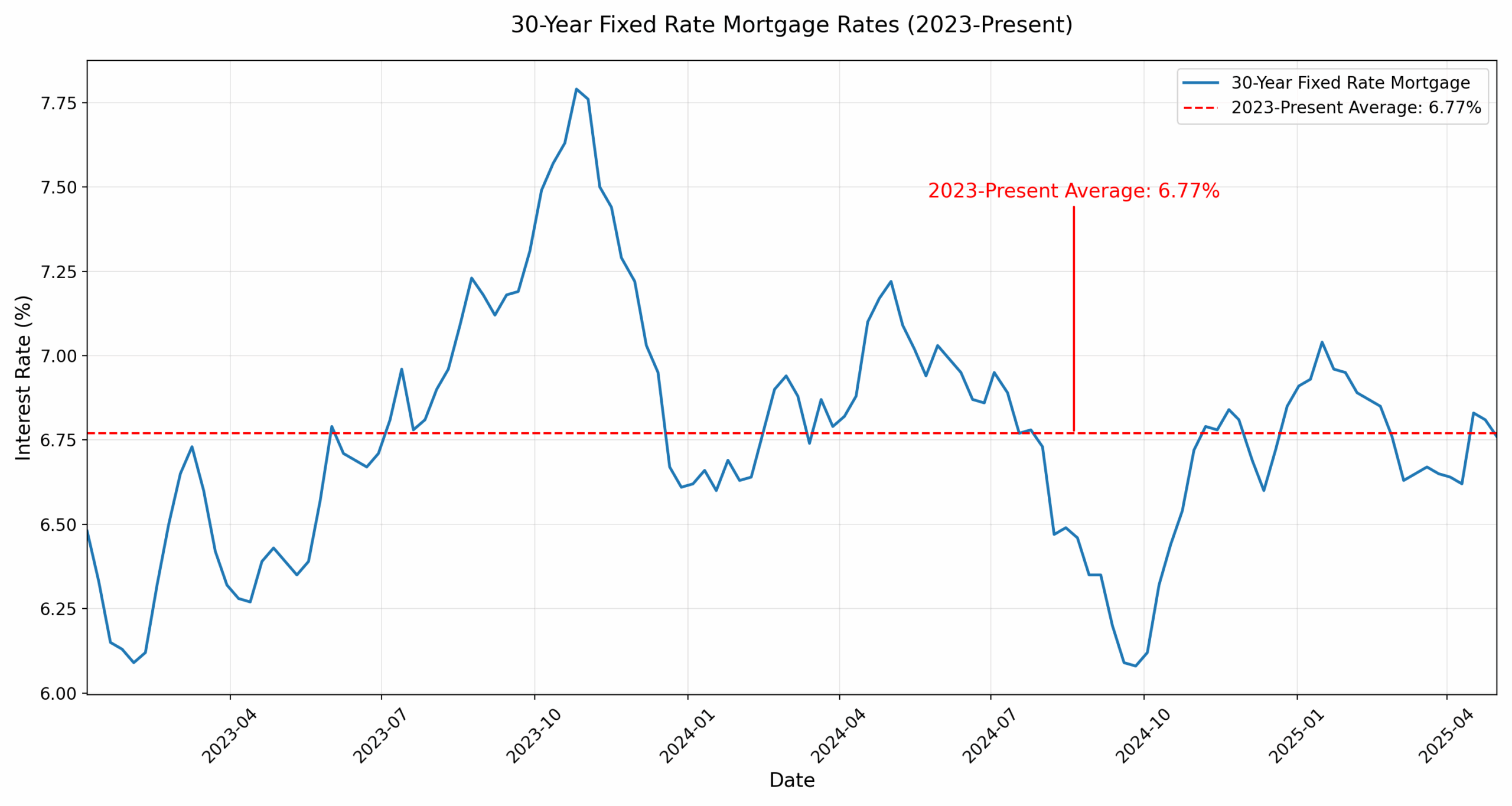 So far in 2025, the average 30-year mortgage rate has averaged around 6.8%, slightly higher than 2024’s 6.7% average but still well above the historic long-term average of 7.7%.