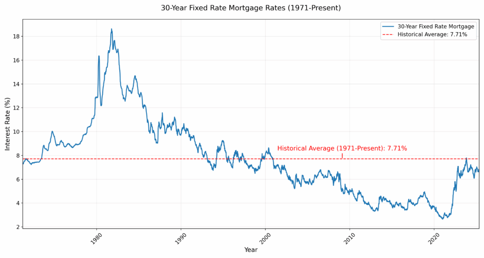 Freddie Mac, the main industry source for mortgage rates, has been keeping records since 1971. Between April 1971 and July 2025, 30-year fixed-rate mortgages averaged 7.71%.